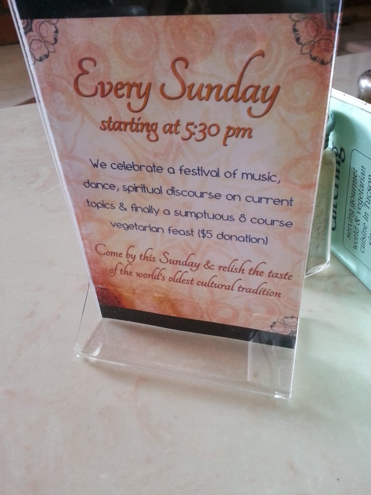 We offer an ever changing assortment of delicious gourmet vegan and vegetarian dishes. We use fresh organic ingredients whenever possible. Our menu is always changing, so please call (520-792-0630) if you would like to know the specific dishes. All brunch plates will come with an organic fruit salad, lentil soup, and rice.